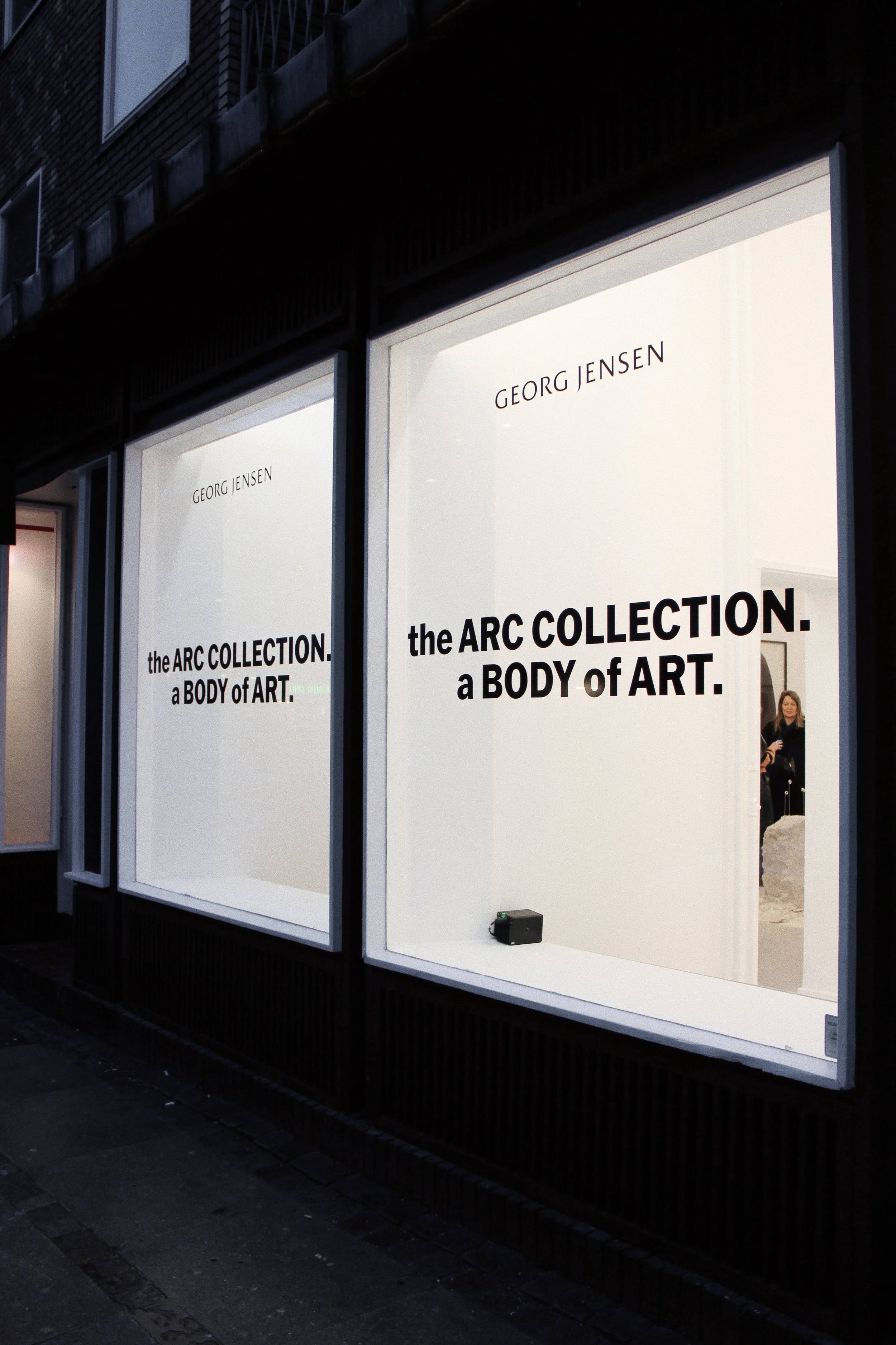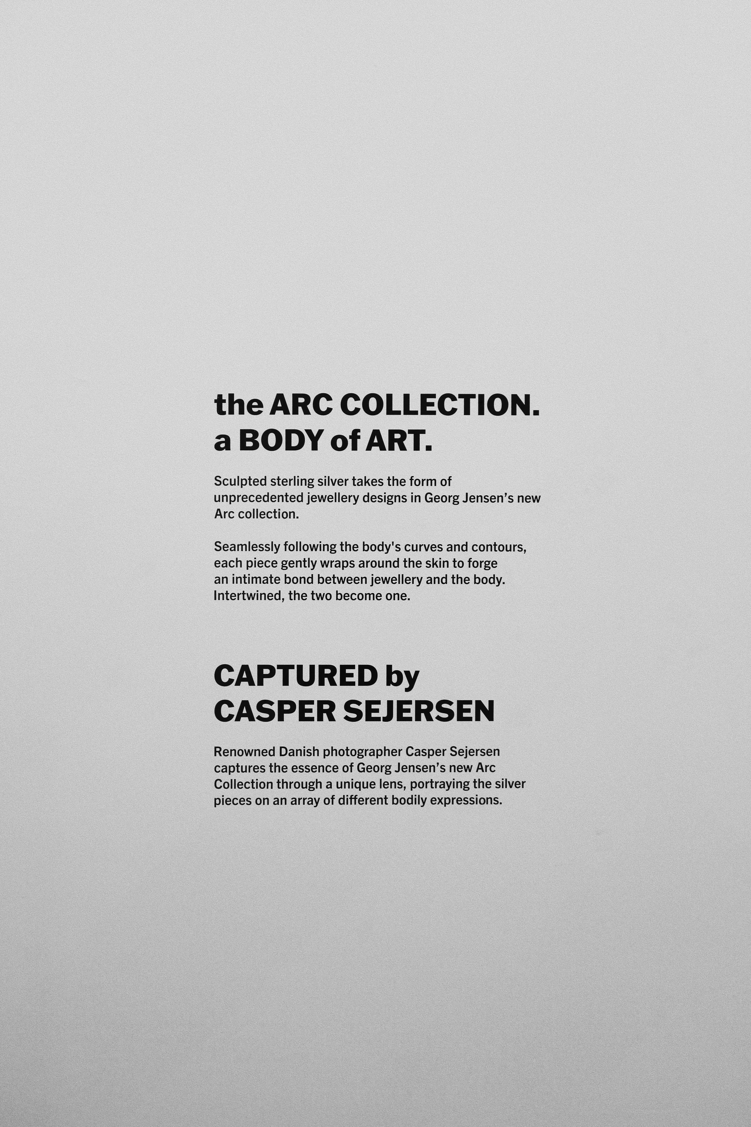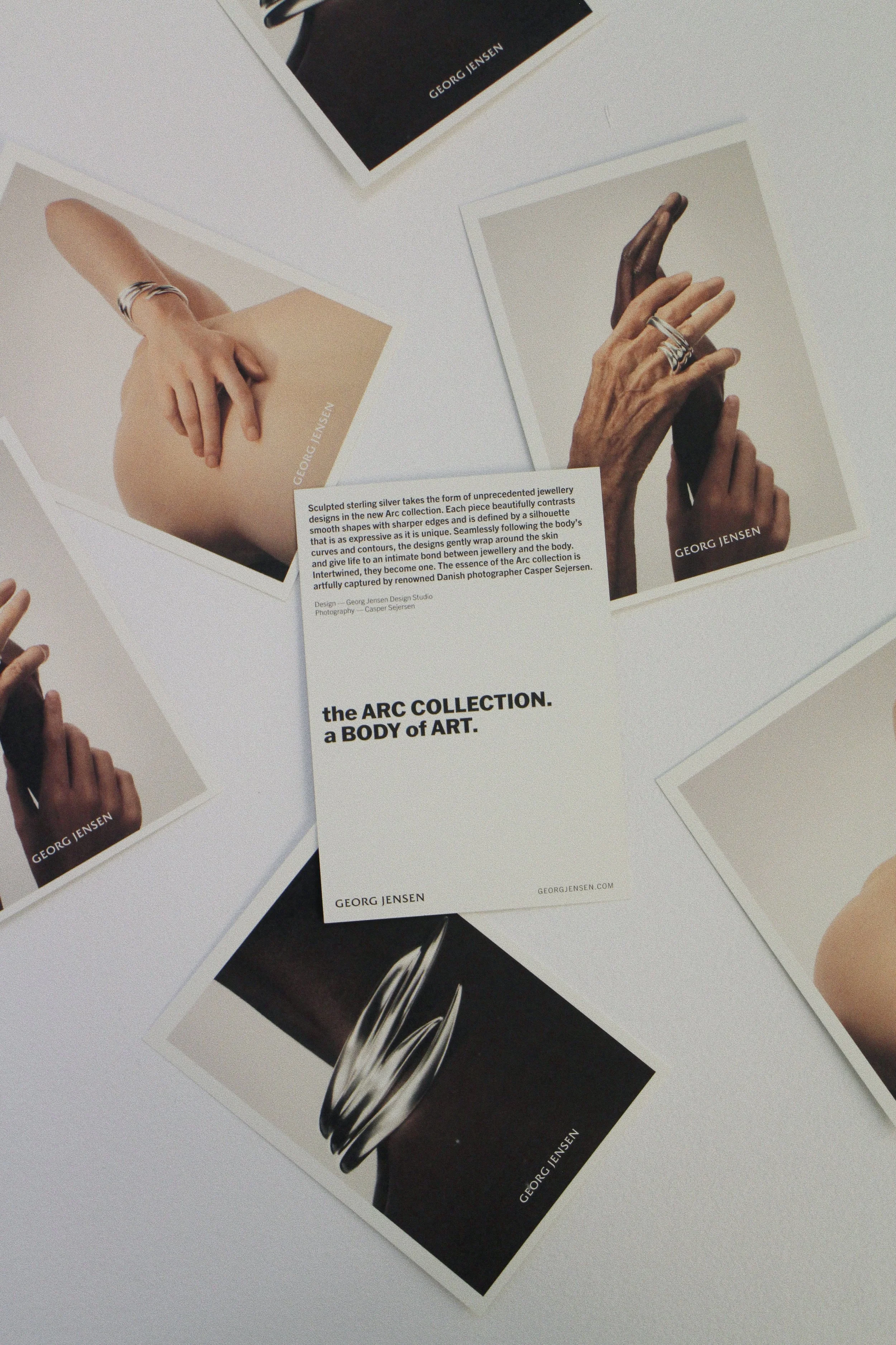 While working at George Jensen, I contributed to the creation of the Arc launch campaign captured by Casper Sejersen. Deliverables included PR material, visual merchandising material, social media content, website assets, emails, product catalogues, etc. Below are some images from the launch exhibition, for which I created the postcards, wall print, and window decal, and the final campaign assets, including video and images.